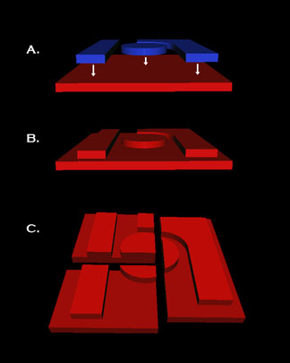 It was time to start on the back wall. I transferred the relief pattern (blue shapes in image below) onto a sheet of 1/8″ acrylic, and cut them out on the band saw. Then I cut a separate sheet of acrylic for the background (red). The shapes were glued to the background sheet using MEK, and then the finished assembly was cut into a jigsaw puzzle of separate ‘blocks’.