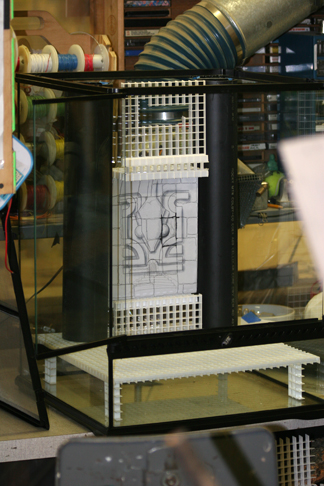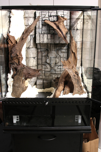 I bought a tank from ExoTerra large enough to accommodate the design and features I wanted. Then started the fun part, cutting and fitting the walls and shapes using styrene ‘eggcrate’ diffusing panels for ceiling lighting. It’s great to work with, you can clip it apart with side cutters and the tabs formed after clipping fit into the open cells of the un-clipped panel. It’s hard to explain, but make sense once you see it, kind of like a model kit crossed with legos.