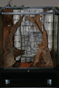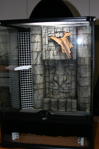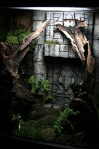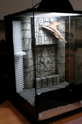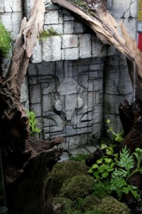 Anyway, I’ve been building my Crested Gecko temple off and on for around 2 years now, and it’s amazing how similar our 2 projects are. My temple, rather than being a flat background, comes out from the background in 3 tiers (as if it’s been buried over time) but the really striking similarity is with the Gecko relief at the centre as we both had the same idea! I’ve dubbed it ‘The Temple Of The Crested God’ though mine is unfinished – not grouted or painted yet. Just Polystyrene/Styrofoam carved and built up with filler. I also detailed it with some plastic bits from Warhammer ‘Lizardmen’ model kits which add some stone gargoyles and Mayan/Aztec style carvings.