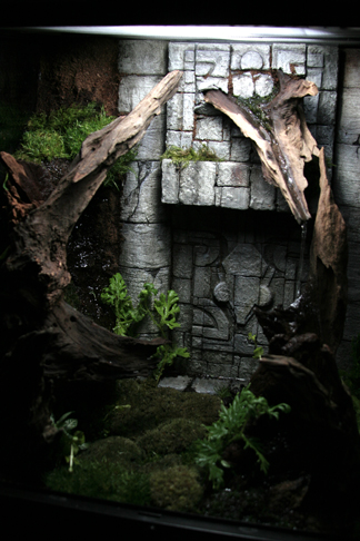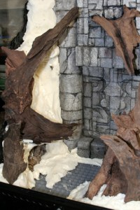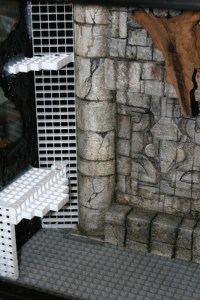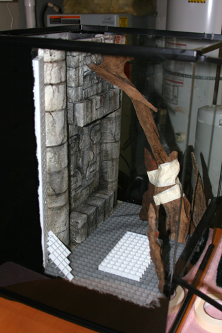 After everything was glued into place, I cut two sections of PVC pipe and scored them with an Exacto knife and Dremel Tool to have the appropriate stacked, cracked stone column look. Then the whole backdrop was painted and aged, and placed into the tank.
