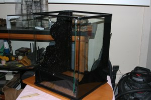 The next step was to mark the areas on the sides of the tank I would need to cover so only the finished portions would be visible. With a sharpie, I outlined the areas to mask using the assembled background structure as a guide. Then removed everything out of the tank and covered (painted for lack of a better term, but more like smearing slime) the inside of the glass tank sides with black silicone.