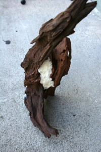 Then it was time to start decorating with pieces of driftwood to create the surrounding ‘jungle’. Some of this was just seeing what would fit, and where and some of it was dictated by wanting to direct water flows, etc.  (Did I mention it was going to have a running waterfall, and fog? oh, but of course! anything to over-complicate things!). I used expandable foam to glue some of the pieces of wood together to get the right shapes, and then went in and ‘sculpted’ the foam to blend the pieces.